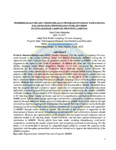 ABSTRACT Problem Statement/Background (GAP): Bandar Lampung City, the capital of Lampung Province, ranks seventh in the number of Micro, Small, and Medium Enterprises (MSMEs) among the 13 regencies and cities in the province. A significant decline in the number of MSMEs in the city was triggered by the impact of the Covid-19 pandemic. To address this issue, the City Government of Bandar Lampung issued Mayor Regulation Number 12 of 2021 concerning the Operational Guidelines for the Distribution of Productive Micro Business Capital Loans. However, the implementation of this interest-free loan program has not fully attracted MSME actors. Purpose: The purpose of this study is to describe the empowerment of MSME actors through an interest-free loan program, describe the supporting and inhibiting factors, and the efforts of the Cooperatives and Micro, Small and Medium Enterprises Service of Bandar Lampung City in overcoming these inhibiting factors. Method: This research employs a qualitative approach with an inductive method. The data collection techniques include interviews, observations, and documentation. Result: The results show that the program has had a positive impact, especially for entrepreneurs who previously faced difficulties in accessing loans from formal financial institutions. Additionally, the number of MSMEs in Bandar Lampung City increased in 2024. Several obstacles were identified, including issues related to BI Checking status, limited personnel, and lack of comprehensive information dissemination to MSME actors. Efforts made include optimizing cross-sectoral collaboration, increasing institutional capacity through additional human resources, and enhancing MSME literacy and capacity through socialization and training programs. Conclusion: The Interest-Free Loan Program run by the Bandar Lampung City Government has made a positive contribution to increasing the number and capabilities of MSMEs through easier access to capital. The success of this program is supported by the development of human resources, strengthening market networks, and collaboration between related institutions. However, the implementation of the program still encounters several obstacles, such as obstacles related to BI checking status, limited assistants, and less than optimal dissemination of information to MSMEs. Various efforts have been made, including strengthening cross-sector cooperation, increasing the number of personnel, and increasing socialization and training. For the future, it is recommended to develop an integrated digital platform, increase the capacity of the apparatus, and strengthen partnerships with external institutions to support the sustainability of the MSME ecosystem. Keywords: Empowerment, Interest-Free Loan Program, MSMEs ABSTRAK Permasalahan/Latar Belakang (GAP): Kota Bandar Lampung sebagai Ibu Kota Provinsi Lampung menempati urutan ketujuh dalam jumlah pelaku Usaha Mikro, Kecil, dan Menengah (UMKM) dari 13 kabupaten/kota di provinsi tersebut. Penurunan signifikan jumlah UMKM di wilayah ini dipicu oleh dampak pandemi Covid-19. Untuk menanggulangi permasalahan tersebut, Pemerintah Kota Bandar Lampung menerbitkan Peraturan Wali Kota Nomor 12 Tahun 2021 tentang Pedoman Operasional Penyaluran Kredit Modal Usaha Mikro Produktif. Namun, implementasi program pinjaman tanpa bunga ini belum sepenuhnya menarik minat pelaku UMKM. Tujuan: Tujuan dari penelitian ini adalah mendeskripsikan pemberdayaan pelaku umkm melalui program pinjaman tanpa bunga, mendeskripsikan faktor pendukung dan penghambat, dan upaya Dinas Koperasi Dan Usaha Kecil Mikro Kota Bandar Lampung dalam mengatasi faktor penghambat tersebut. Metode: Penelitian ini menggunakan penelitian kualitatif dengan pendekatan induktif. Teknik yang digunakan dalam mengumpulkan data yaitu dengan wawancara, observasi, kemudian dokumentasi. Hasil/Temuan: bahwa program memberikan dampak positif, khususnya bagi pelaku usaha yang kesulitan mengakses pembiayaan dari lembaga keuangan formal. Selain itu, terjadi peningkatan jumlah UMKM di Kota Bandar Lampung pada tahun 2024. Adapun hambatan dalam pelaksanaan program mencakup permasalahan status BI Checking, keterbatasan personel pelaksana, serta kurangnya penyebaran informasi kepada pelaku UMKM. Upaya yang dilakukan antara lain optimalisasi kerja sama lintas sektor, penambahan sumber daya manusia, serta peningkatan literasi dan kapasitas pelaku UMKM melalui sosialisasi dan pelatihan. Kesimpulan: Program Pinjaman Tanpa Bunga yang dijalankan oleh Pemerintah Kota Bandar Lampung memberikan kontribusi positif dalam peningkatan jumlah dan kemampuan pelaku UMKM melalui akses modal yang lebih mudah. Keberhasilan program ini didukung oleh pengembangan sumber daya manusia, penguatan jaringan pasar, serta kolaborasi antar lembaga terkait. Namun, pelaksanaan program masih menemui beberapa kendala, seperti adanya hambatan terkait status BI checking, keterbatasan tenaga pendamping, dan kurang optimalnya penyebaran informasi kepada pelaku UMKM. Berbagai upaya telah dilakukan, termasuk memperkuat kerja sama lintas sektor, menambah jumlah personel, serta meningkatkan sosialisasi dan pelatihan. Untuk masa depan, disarankan pengembangan platform digital terpadu, peningkatan kapasitas aparatur, dan penguatan kemitraan dengan lembaga eksternal guna mendukung keberlanjutan ekosistem UMKM. Kata kunci: Pemberdayaan, Program Pinjaman Tanpa Bunga, UMKM