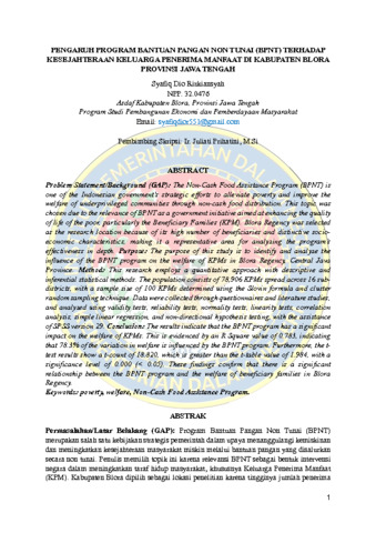 ABSTRAK Permasalahan/Latar Belakang (GAP): Program Bantuan Pangan Non Tunai (BPNT) merupakan salah satu kebijakan strategis pemerintah dalam upaya menanggulangi kemiskinan dan meningkatkan kesejahteraan masyarakat miskin melalui bantuan pangan yang disalurkan secara non tunai. Penulis memilih topik ini karena relevansi BPNT sebagai bentuk intervensi negara dalam meningkatkan taraf hidup masyarakat, khususnya Keluarga Penerima Manfaat (KPM). Kabupaten Blora dipilih sebagai lokasi penelitian karena tingginya jumlah penerima manfaat serta karakteristik sosial ekonomi masyarakatnya yang unik, sehingga dinilai representatif untuk menganalisis efektivitas program secara lebih komprehensif. Tujuan: Tujuan dari penelitian ini adalah untuk mengetahui dan menganalisis pengaruh Program BPNT terhadap kesejahteraan KPM di Kabupaten Blora, Provinsi Jawa Tengah. Metode: Penelitian ini menggunakan pendekatan kuantitatif dengan metode deskriptif dan analisis statistik inferensial. Populasi dalam penelitian ini berjumlah 78.906 KPM yang tersebar di 16 kecamatan, dengan sampel sebanyak 100 KPM yang dipilih menggunakan rumus Slovin dan teknik cluster random sampling. Pengumpulan data dilakukan melalui penyebaran kuesioner dan studi literatur, dengan analisis data yang meliputi uji validitas, reliabilitas, normalitas, linearitas, korelasi, regresi linear sederhana, serta uji hipotesis non-direksional menggunakan bantuan software SPSS 29. Hasil/Temuan: Hasil penelitian menunjukkan bahwa Program BPNT berpengaruh signifikan terhadap kesejahteraan KPM. Hal ini dibuktikan dengan nilai R Square sebesar 0,783, yang berarti 78,3% variabel kesejahteraan dipengaruhi oleh Program BPNT. Nilai t hitung sebesar 18.820 lebih besar dari t tabel (1.984), dengan signifikansi 0.000 < 0.05, yang menunjukkan bahwa terdapat pengaruh yang signifikan antara BPNT terhadap kesejahteraan keluarga penerima manfaat di Kabupaten Blora. Kata Kunci: kemiskinan, kesejahteraan, Program Bantuan Pangan Non Tunai